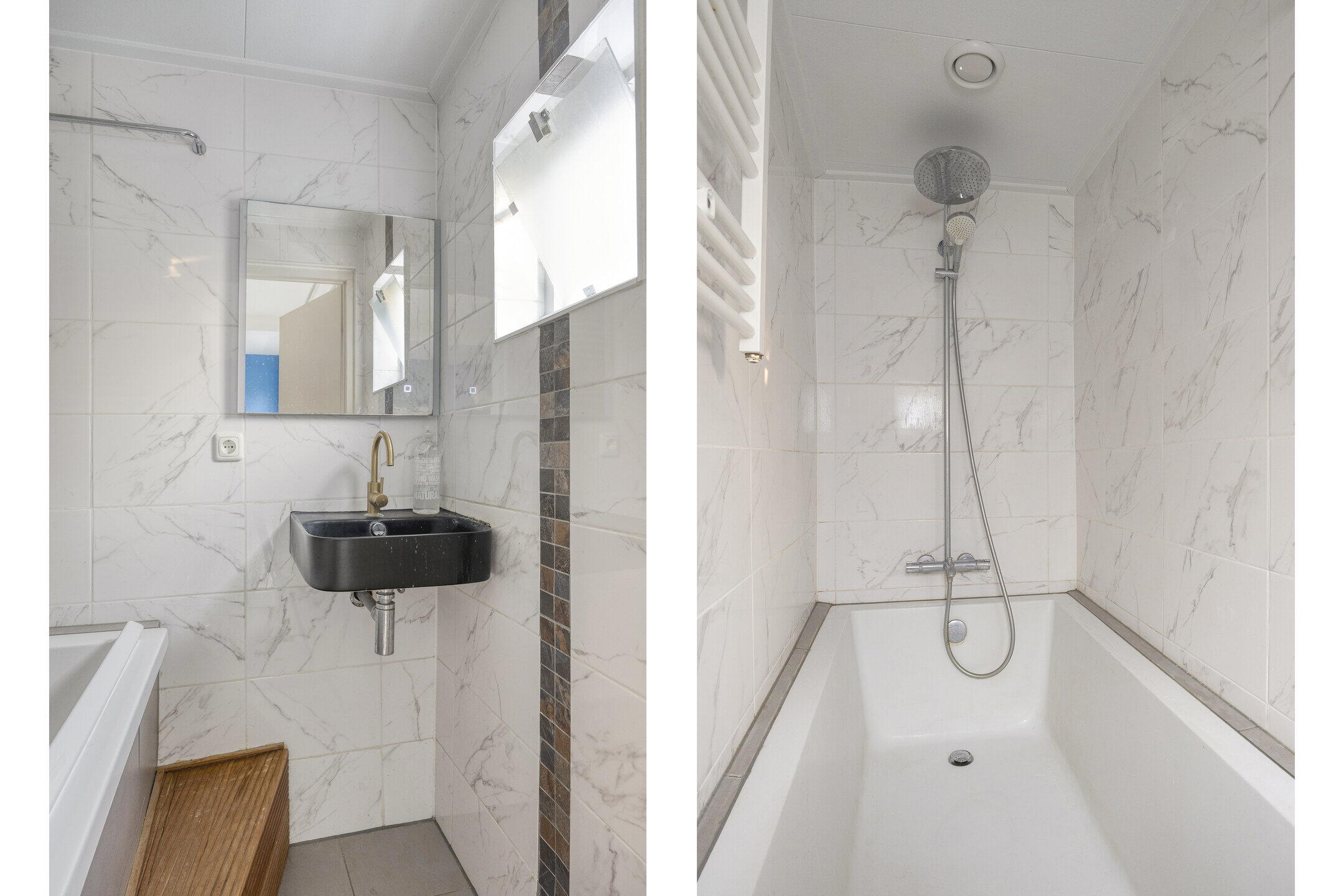 De badkamer is netjes afgewerkt met lichte tegels en voorzien van een ligbad met douche en wastafel, een fijne plek om te ontspannen.