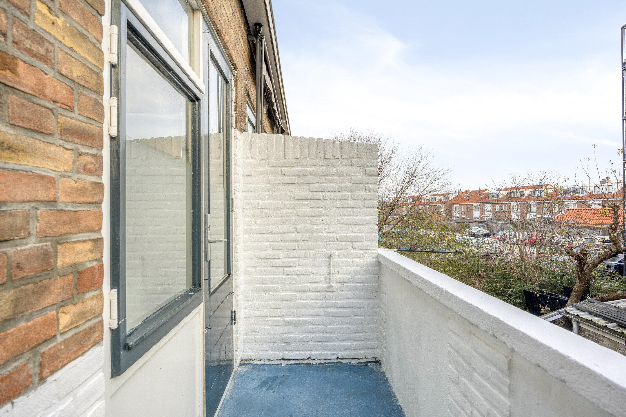 De keuken bevindt zich aan de achterzijde en is voorzien van een praktisch recht keukenblok met lichte fronten en bovenkasten. Via een openslaande deur bereik je het balkon.