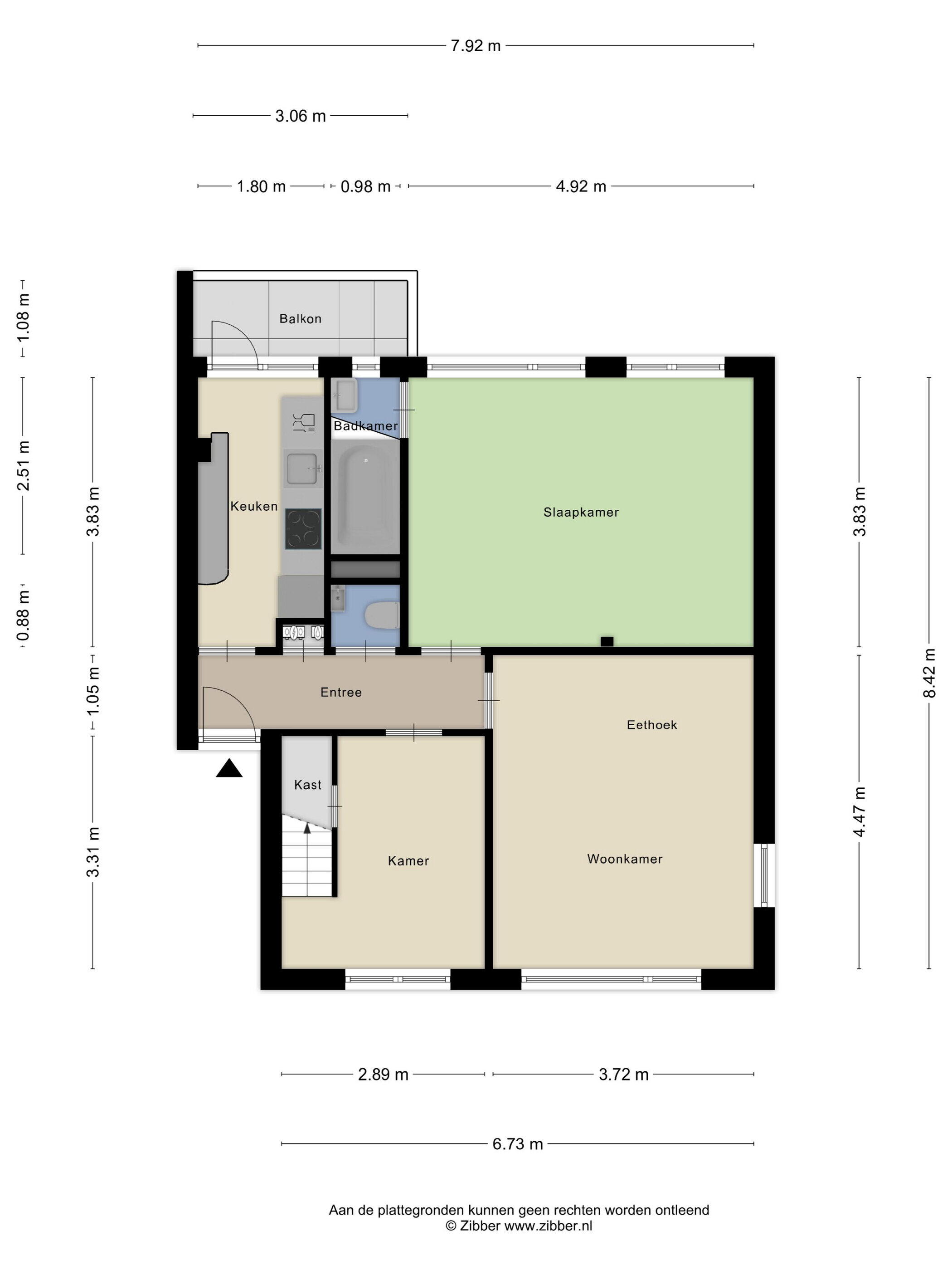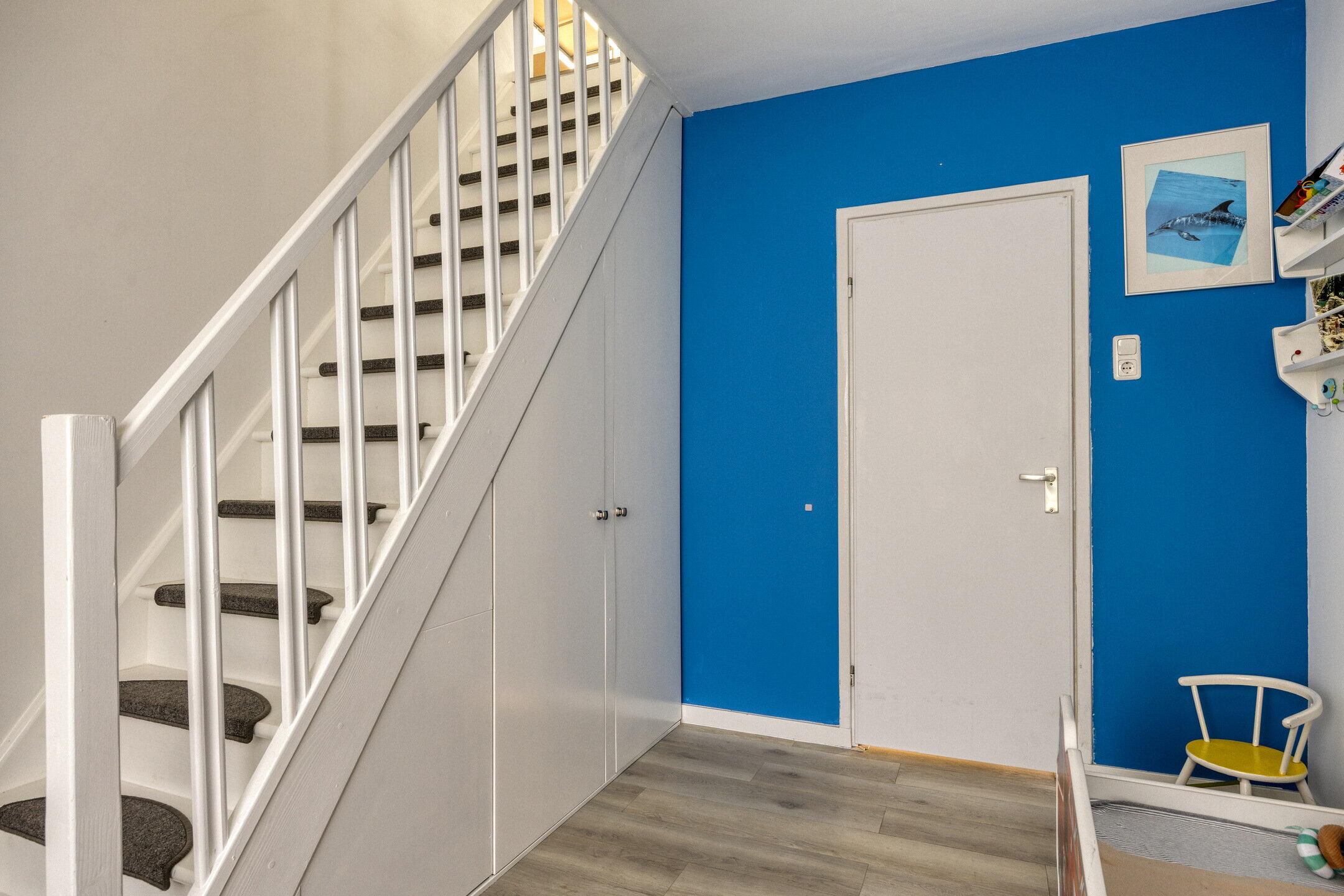 De hal geeft toegang tot vrijwel alle vertrekken: de meterkast, het toilet, de keuken, de woonkamer, een slaapkamer, een extra (slaap)kamer en een trap naar de bovenliggende verdieping.